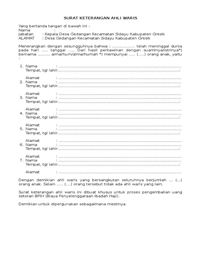 Surat pernyataan ahli waris atau bisa juga disebut dengan surat keterangan hak waris adalah surat yang memuat tentang keterangan yang berkaitan dengan orang . Untuk membuat surat keterangan hak . Fotokopi surat keterangan kematian pewaris dari lurah/kepala desa tempat tinggal pewaris, pada kertas ukuran a4, dimeterai 6000, lalu di cap di kantor pos. Saya sudah melengkapi surat ahli waris dari ayah ke anaknya. Surat pernyataan dan keterangan ahli waris.